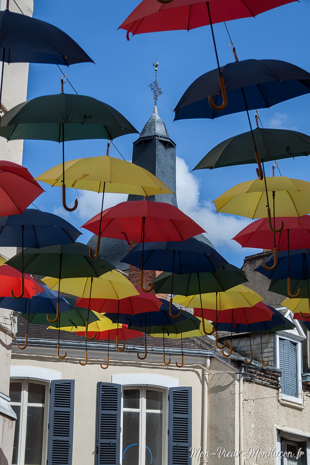 Rue Porte Saint-Pierre : une pluie de parapluies avec le clocher de l'église Saint-Pierre en arrière-plan