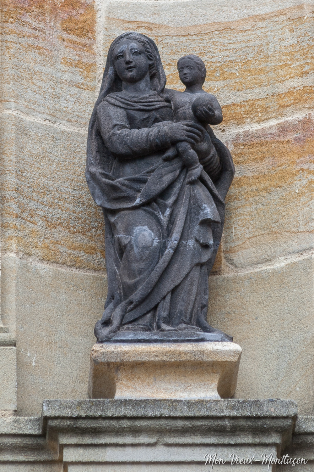 Église Notre-Dame, entrée ouest : Vierge à l'Enfant en pierre de Volvic, signée Bachelier datée de 1810. Cette statue était auparavant sur le couvercle de la fontaine de la place du même nom. Régulièrement vandalisée, elle est maintenant en sécurité.