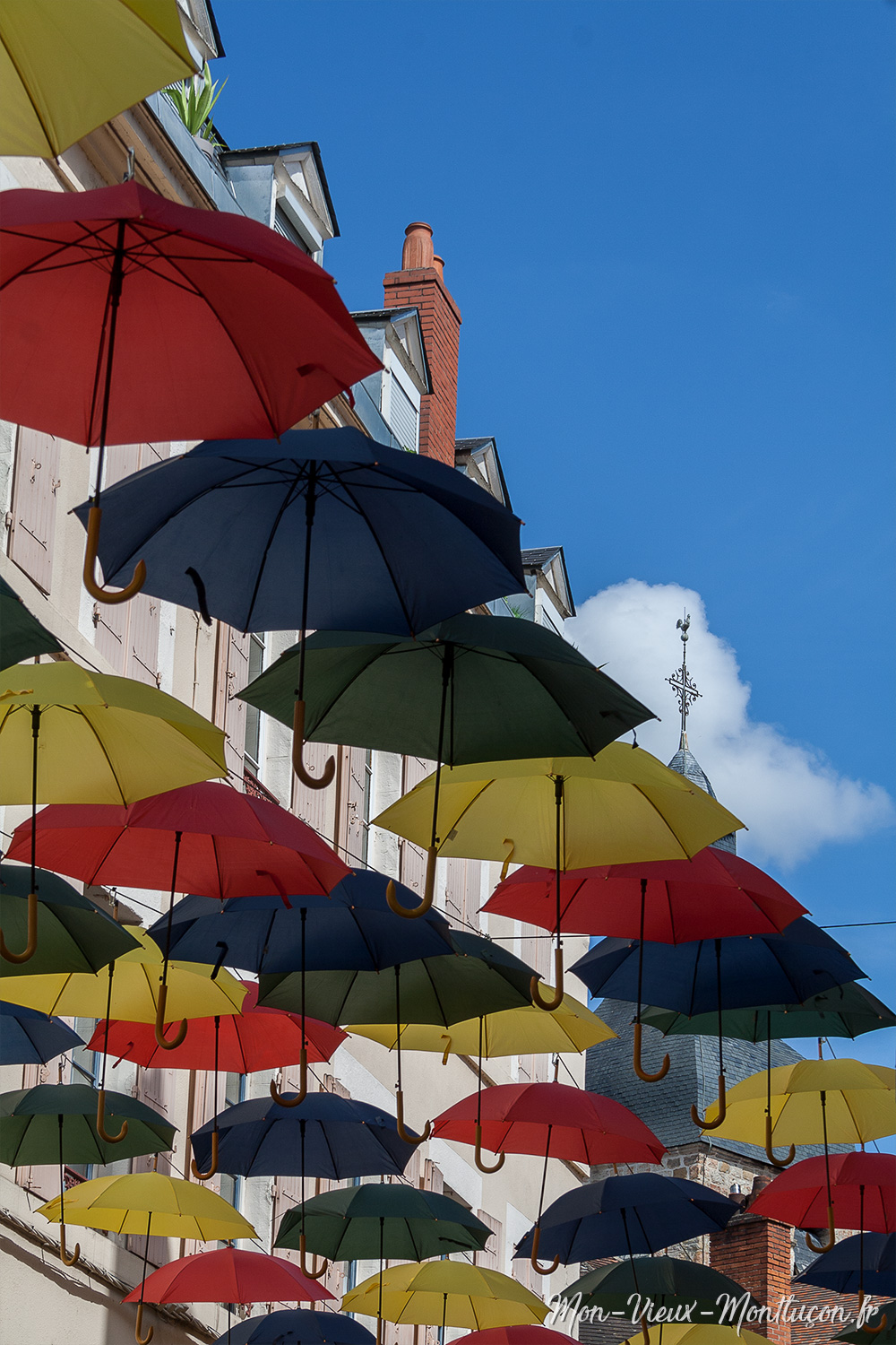Rue Porte Saint-Pierre : une pluie de parapluies avec le clocher de l'église Saint-Pierre en arrière-plan