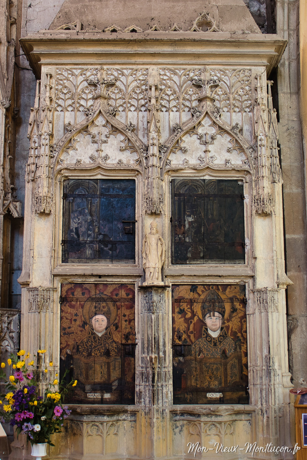 Souvigny, armoire aux reliques : les panneaux du haut, noircis par la fumée des cierges, représentent Mayeul (à gauche) et Odilon (à droite) célébrant l'eucharistie